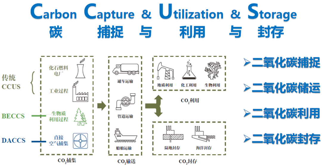 二氧化碳(CO2)捕集利用与封存(CCUS)是指将CO2从工业过程、能源利用或大气中分离出来,直接加以利用或注入地层以实现CO2永久减排的过程,主要包括CO2捕捉、输送、利用和封存等环节。作为一项有望实现化石能源大规模低碳利用的战略性技术,CCUS具有大幅度减少传统化石能源整个生命周期内的温室气体排放和实现绿色能源负碳排放潜力,是未来减少CO2排放、保障能源安全、构建生态文明和实现可持续发展的重要手段。