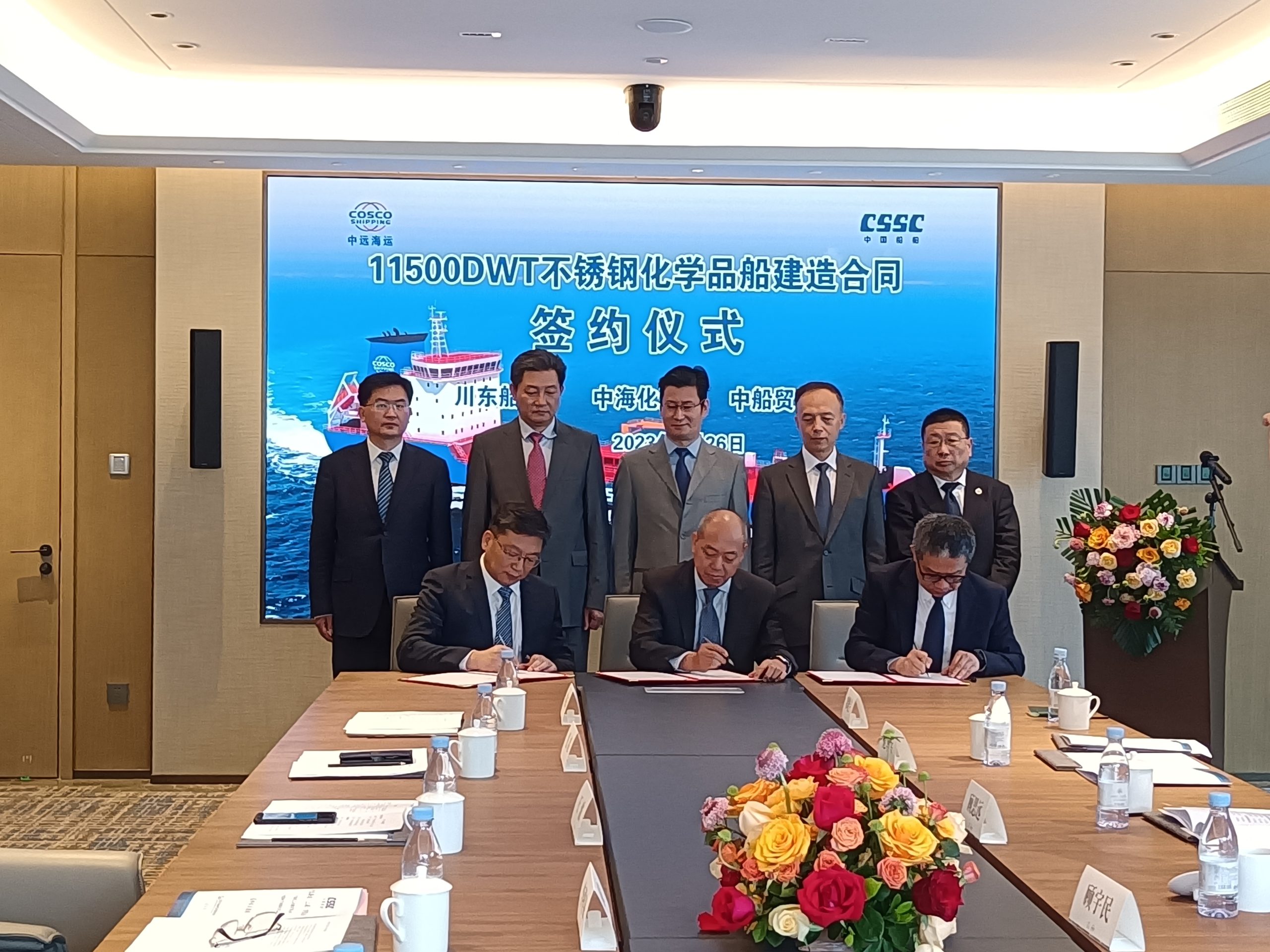 4月26日,中国船舶集团川东造船联合中船贸易与上海中远海运下属子公司中海化运签订了一艘11500载重吨不锈钢化学品船建造合同。该项目是川东造船相继为中远海运集团建造2艘7800载重吨、2艘13800载重吨、2艘8000载重吨不锈钢化学品后的第四次合作。