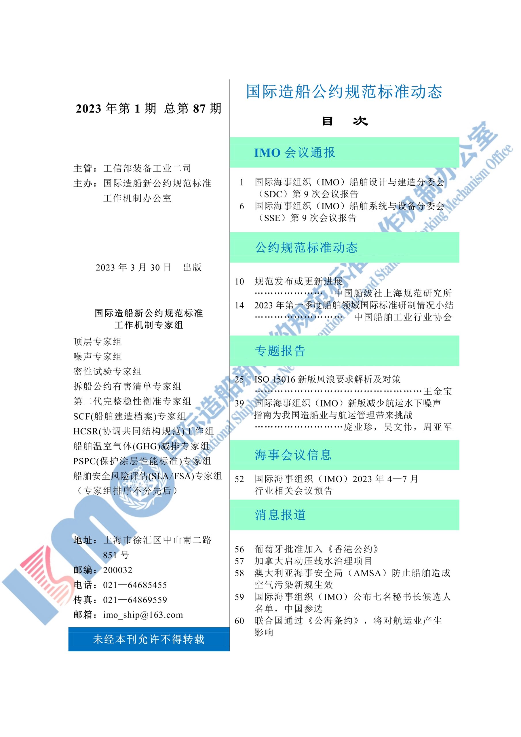 《国际造船公约规范标准动态》是一本由国际造船新公约规范标准工作机制办公室编辑出版的行业内部刊物,每季度出版一期。现通过“IMO工作机制”公众号向造船人发布!