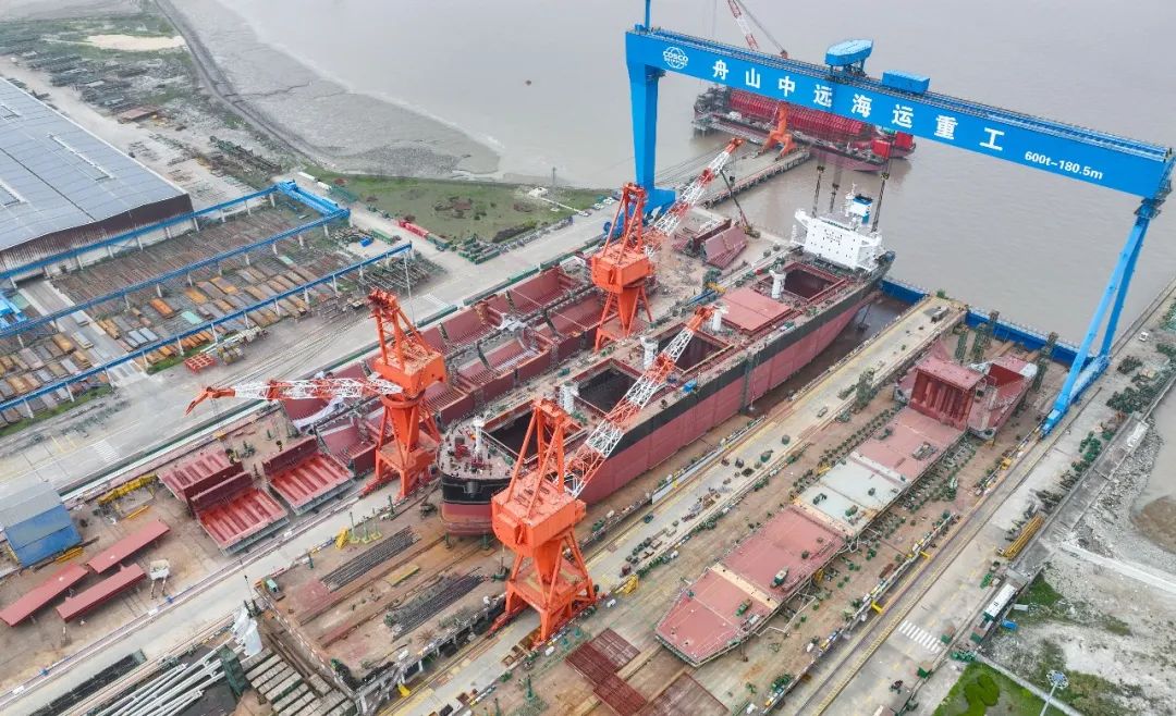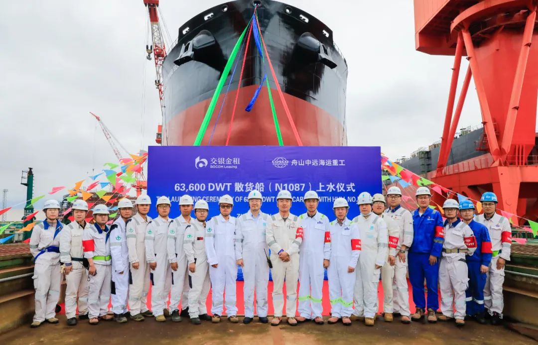 5月8日上午,舟山中远海运重工为交银金融租赁股份有限公司建造的8艘6.36万吨系列散货船第二艘N1087在公司1号船台顺利上水。