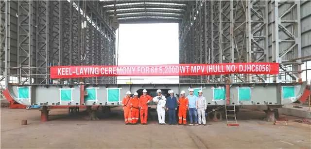 5月6日下午,天海防务子公司江苏大津重工有限公司为德国船东JSP公司建造的5200吨多用途船—— 5#6#(DJHC6055/6056)项目举行上船台仪式。挪威船级社庞国耀先生,船东LASS先生及大津重工项目参建人员共同见证。