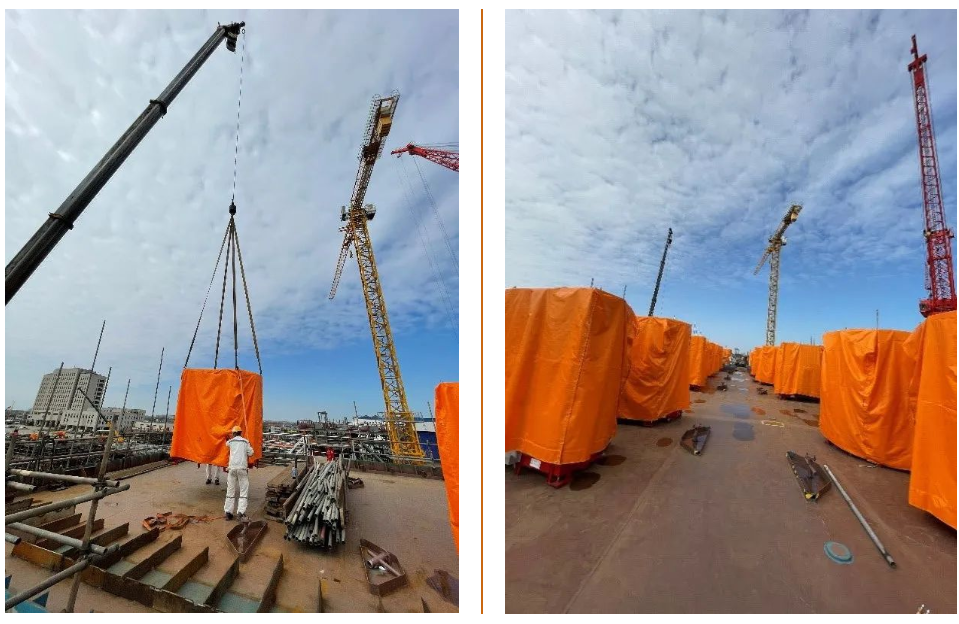 该船是Cadeler自升式风电安装船系列首制船。此项目三个楼层共87个单元分三次完成吊装,为上部甲板分段的搭载创造了条件。