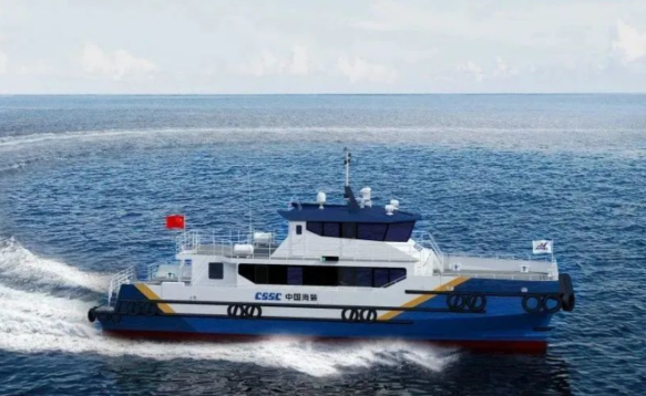 本次下水的船舶总长30.25米,总宽9.50米,型深3.30米,吃水1.7米,设计航速25节,船型在英辉南方成熟的半小水线面船型的基础上结合运维海域特点进行优化升级,可有效减少船体在波浪中的运动响应,使船舶具备在2.5米浪高情况下安全顶靠海上风电桩的能力,具有良好的适航性、抗浪性、快速性和操纵性。