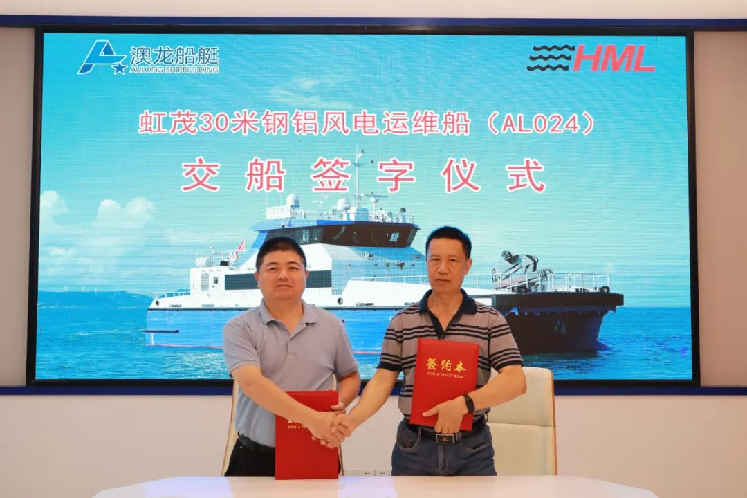 近日,江龙船艇子公司澳龙船艇承建的广东虹茂航运有限公司两艘30米钢铝复合风电运维船1号船喜迎交船,该船是澳龙船艇承建的首艘钢铝复合风电运维船,未来将用于广东海上风电场的日常运行和维护。