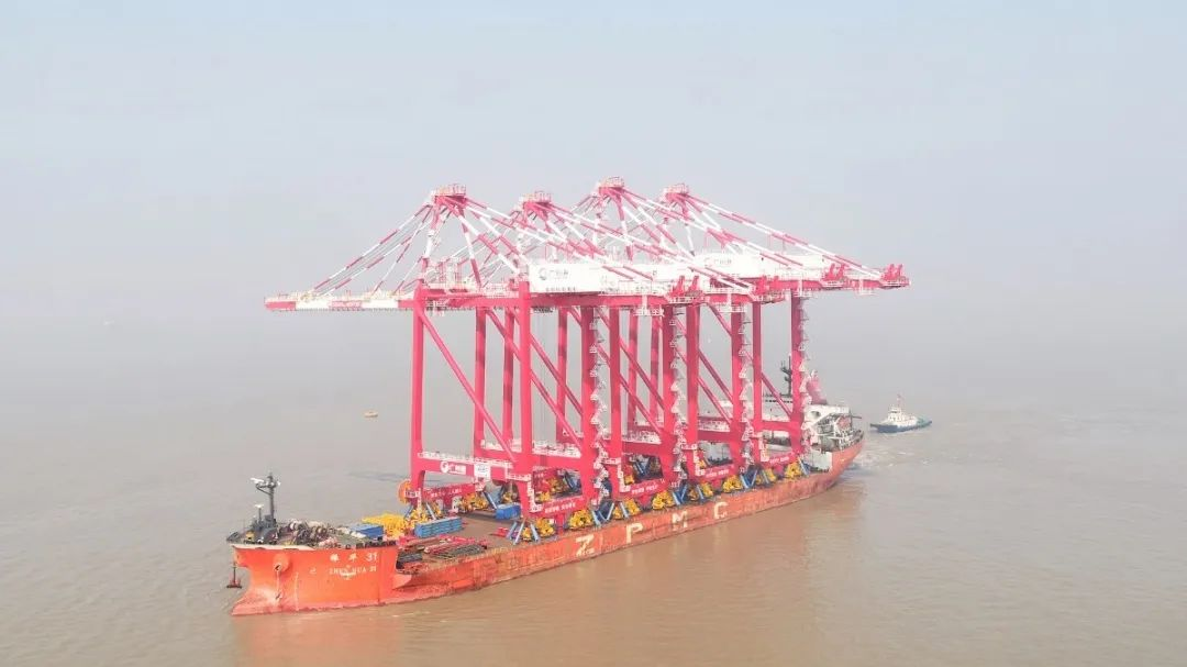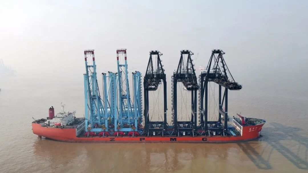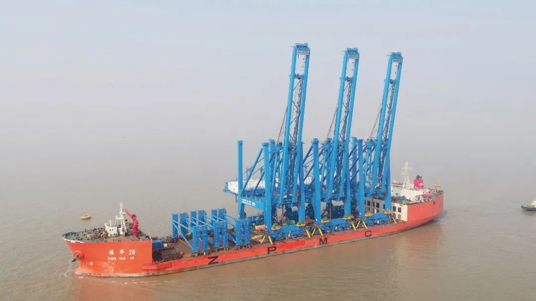5月13日,广州南沙自动化码头4台岸桥搭乘“振华31”轮,从长兴分公司码头发运。
