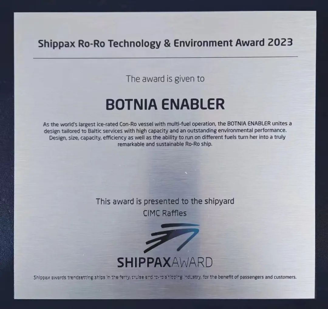 近日,全球滚装船专业论坛Shippax发布2023年获奖名单,中集来福士为瑞典航运巨头WALLENIUS SOL建造的5800米车道双燃料冰级货物滚装船BOTNIA ENABLER荣获“2023年滚装船技术与环境奖”,这是中集来福士继2022年在业界知名渡轮航运峰会Ferry Shipping Summit上被评为“2022年度最佳滚装船”的荣誉后,再次获得滚装船领域的奖项。