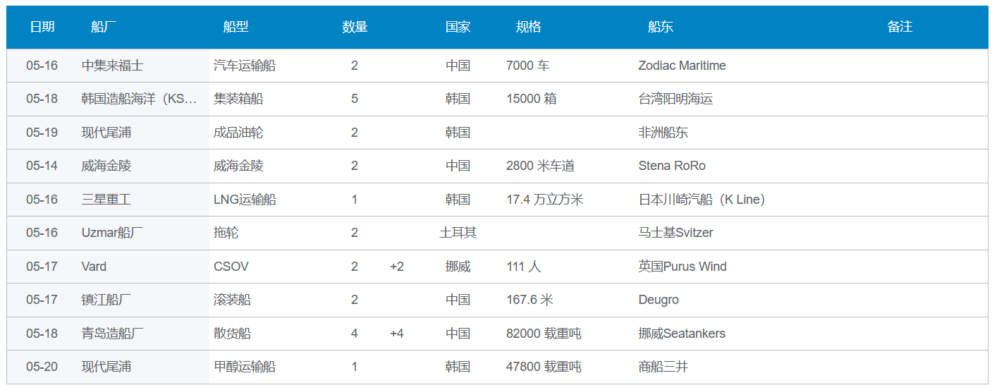 据龙船订单库(https://www.imarine.cn/order)统计,5月15日至5月21日报道的新船订单有23+6艘。