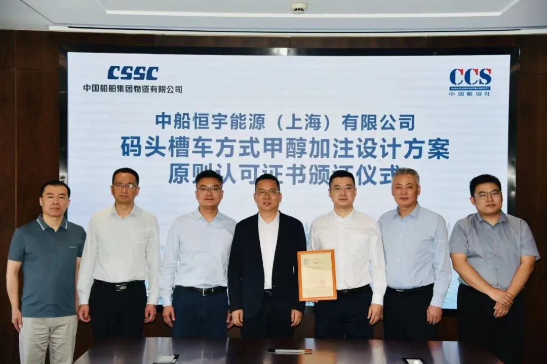 中国船级社(CCS)依照《船舶甲醇燃料加注作业指南》(2023)、《船舶应用甲醇∕乙醇燃料指南》(2022)等有关标准,对中船恒宇提交的《码头槽车方式甲醇加注设计方案》进行了技术方案符合性审查,确保符合规范指南的适用要求,经审查后,CCS决定授予原则性认可证书。