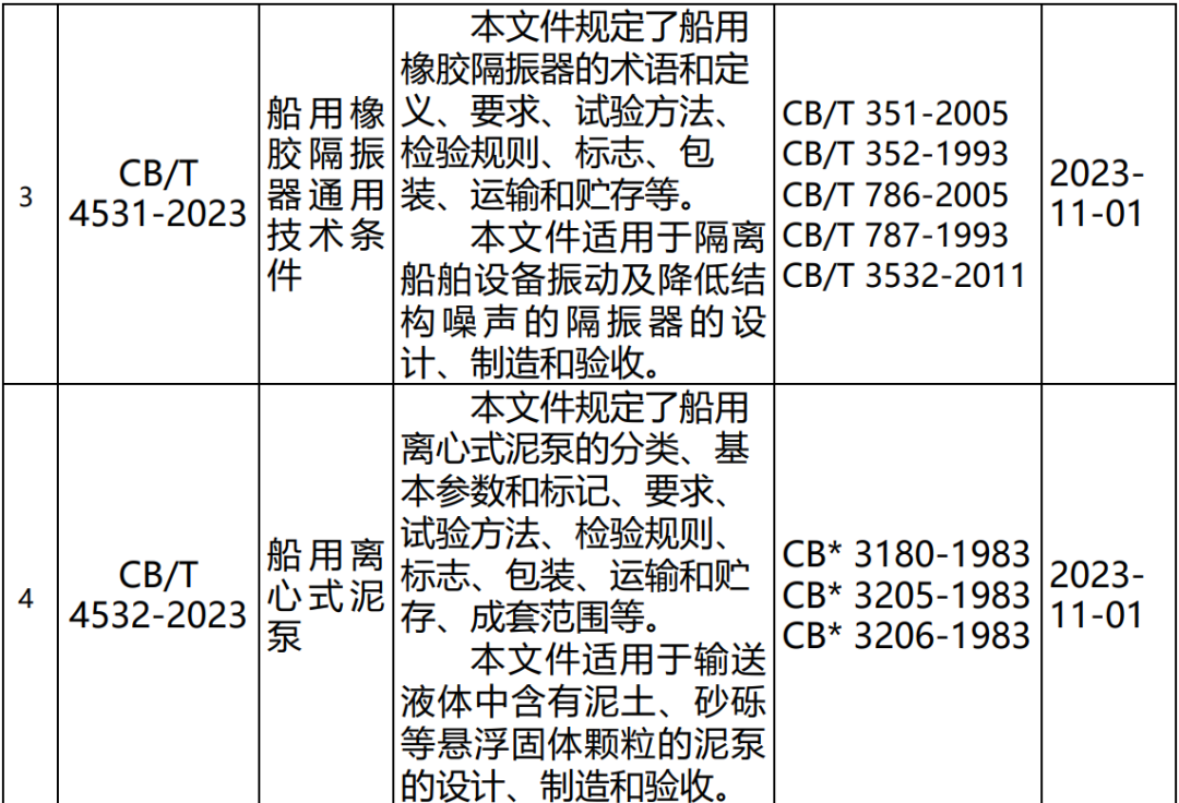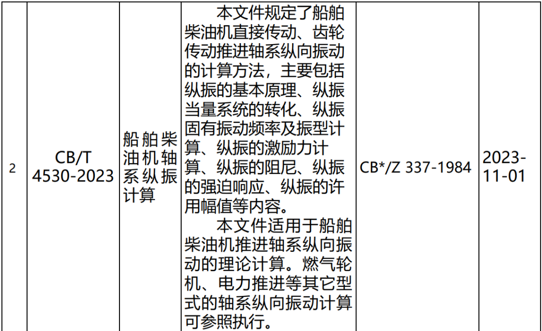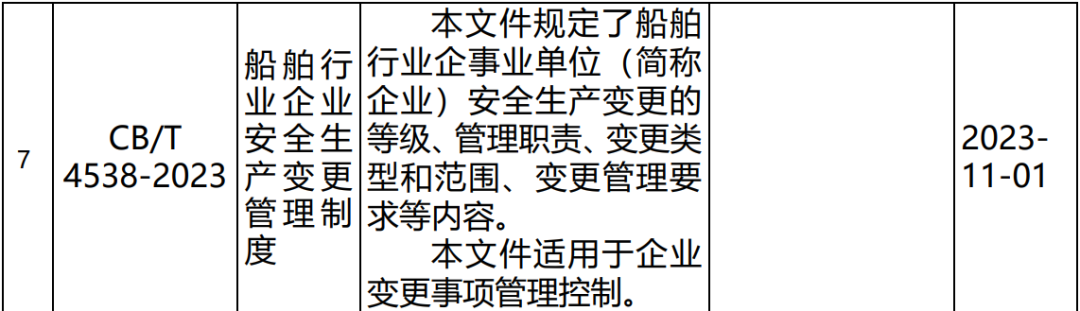 5月22日,工业和信息化部发布2023年第7号公告,批准《工业用乙二胺四乙酸》等586项行业标准,其中船舶行业标准共8项,包括新制定项目3项、修订项目5项,涉及船舶轴系及推进装置、舱室辅机与机舱设备、船舶安全生产等专业领域,具体内容详见附表。以上船舶行业标准由中国船舶集团有限公司综合技术经济研究院组织出版。