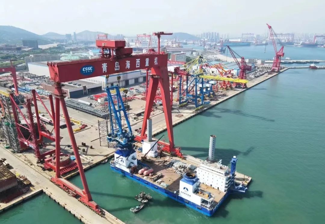 5月24日上午,华夏金租神大01号1200T自升式风电安装平台顺利从江苏大津重工泰州分公司拖航至青岛海西重机。
