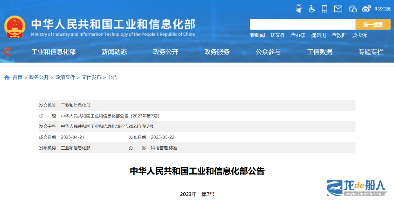 近日,工业和信息化部发布2023年第7号公告,批准了586项行业标准,其中船舶行业标准共8项,包括新制定项目3项、修订项目5项,涉及船舶轴系及推进装置、舱室辅机与机舱设备、船舶安全生产等专业领域。