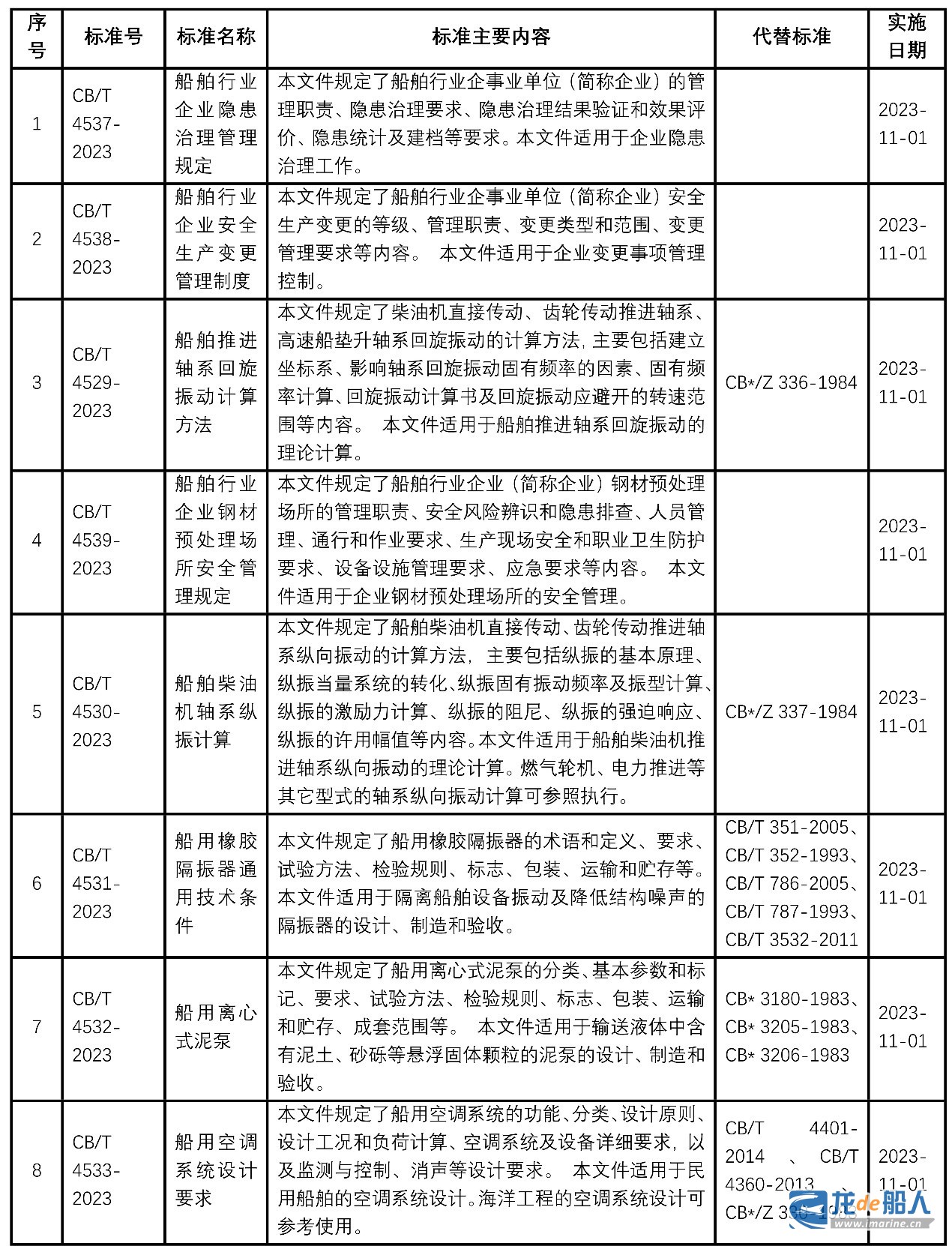 8项标准分别为:《CB/T 4537-2023 船舶行业企业隐患治理管理规定》、《CB/T 4538-2023 船舶行业企业安全生产变更管理制度》、《CB/T 4539-2023 船舶行业企业钢材预处理场所安全管理规定》、《CB/T 4529-2023 船舶推进轴系回旋振动计算方法》、《CB/T 4530-2023 船舶柴油机轴系纵振计算》、《CB/T 4531-2023 船用橡胶隔振器通用技术条件》、《CB/T 4532-2023 船用离心式泥泵》、《CB/T 4533-2023 船用空调系统设计要求》,自2023年11月1日起实施。