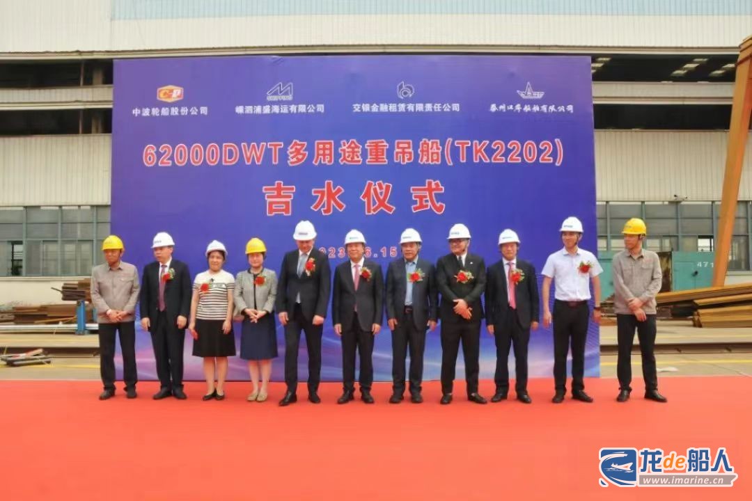 6月15日下午,泰州口岸船舶新区——泰州众航船舶为嵊泗浦盛海运建造的一艘62000DWT多用途重吊船(TK2202)举行吉水仪式。中波轮船股份公司中方总经理朱德章、波方总经理马切依·温皮茨基、浦盛海运总经理毛思远一行共同见证吉水盛况。