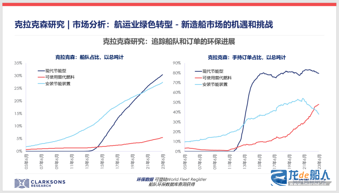 环保船队发展:目前以总吨计,克拉克森统计全球船队中现代节能型船舶占比30.4%,27.3%已安装节能装置,此外5.5%可使用替代燃料。在航运业绿色转型的进程中,替代燃料的应用是重要的解决方案。近两年替代燃料动力船舶发展加快,2022年替代燃料动力船新签订单占比约60%,2023年前五个月替代燃料动力新签订单的比例也达到了40%。