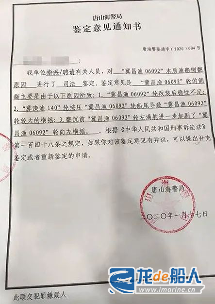 唐山海警局下发的《鉴定意见通知书》
