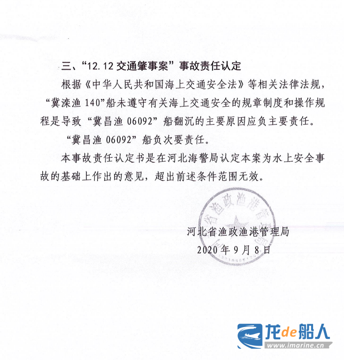 2020年9月,河北省渔政渔港管理局作出《12.12交通肇事案事故责任认定书》。该认定书的结论为:“冀滦渔140”船未遵守有关海上交通安全的规章制度和操作规程,是导致“冀昌渔06092”船翻沉的主要原因,应负主要责任;“冀昌渔06092”船负次要责任。