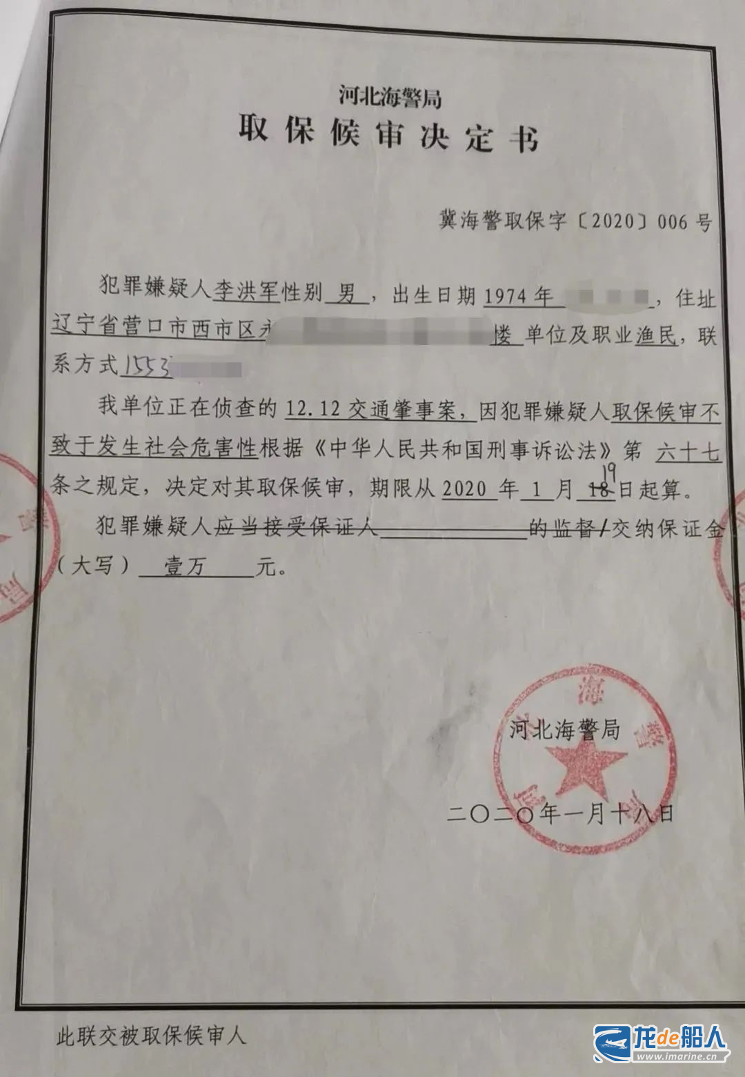 此案被唐山海警局定性为“交通肇事案”后,在“事故”中被认定负次要责任的李洪军,也成为了“犯罪嫌疑人”。2020年1月,海警部门对“犯罪嫌疑人李洪军”作出取保候审决定,李洪军交纳了取保候审保证金1万元。