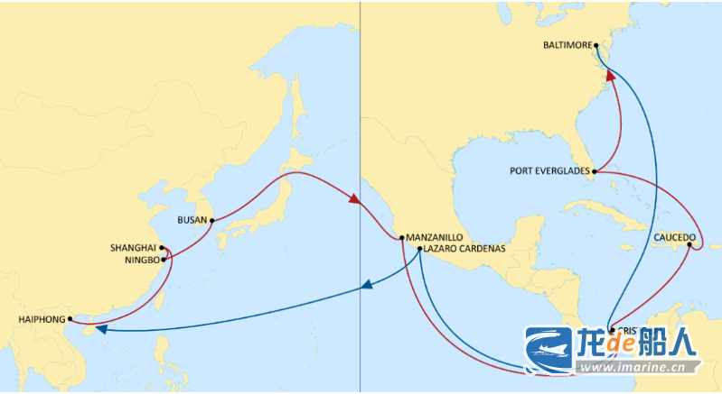 新的挂靠港序为:海防-上海-宁波-釜山-曼萨尼约-克里斯托瓦尔-考西多-埃弗格雷斯港-巴尔的摩-拉萨罗卡德纳斯-海防。