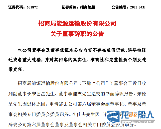 6月30日,招商轮船发布公告称,宋德星先生因退休原因,申请辞去公司第六届董事会副董事长、董事及董事会相关专门委员会委员职务。李佳杰先生因工作调整变动原因申请辞去公司第六届董事会董事及董事会相关专门委员会委员职务。