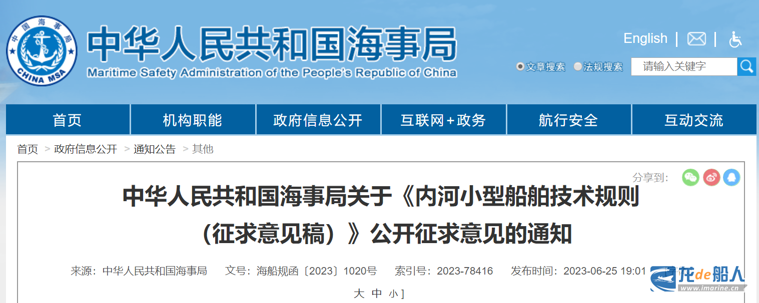 为保障内河小型船舶及国内航行小型海船安全航行作业、防止船舶造成污染,中国海事局发布了《国内航行小型海船技术规则(征求意见稿)》、《内河小型船舶技术规则(征求意见稿)》,并向社会公开征求意见。意见反馈截止时间为2023年7月25日。