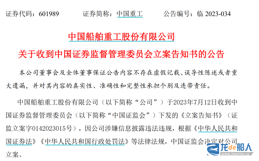 7月12日晚间,中国船舶重工股份有限公司披露了公司收到中国证券监督管理委员会立案告知书的公告。