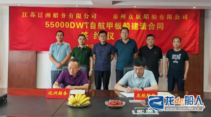 7月12日上午,泰州众航船舶有限公司(以下简称:众航船舶)与江苏泛洲船务有限公司(以下简称:泛洲船务)在南京正式举行55000DWT自航甲板船建造合同签约仪式。