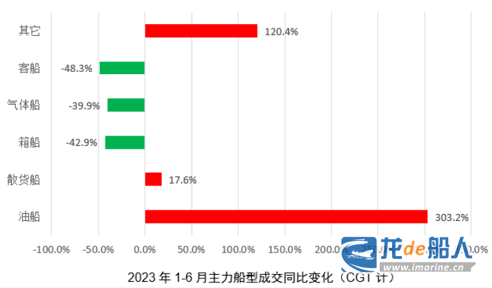 油船夺得半年成交冠军,船型轮动的趋势明显。上半年,成交船型以CGT计的份额占比从高至低依次为油船(23%)、气体运输船(21%)、集装箱船(21%)、散货船(20%)、其它船舶(14%)以及客船(1%)等。油船、特种船舶(其它船舶)市场上半年成交量大幅增加。其中,油船涨幅达到303%,对新造船市场的贡献最大,也超过气体船和集装箱船成为半年的成交冠军;特种船舶市场在汽车运输船的加持下涨幅也是十分明显。两种主力船型的表现符合之前的预期。而散货船同比17.6%的涨幅则带来不小“惊喜”,说明下游运费收益的好坏已经不是决定新造船市场的唯一因素。