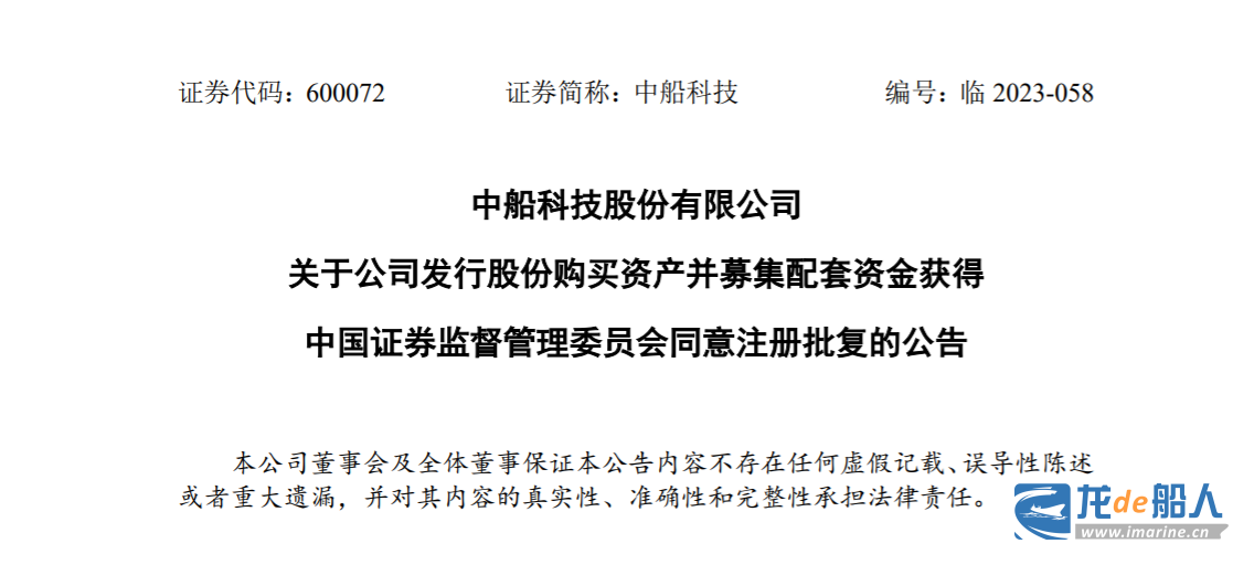 公告披露,中船科技于2023年7月24日收到中国证券监督管理委员会出具的《关于同意中船科技股份有限公司发行股份购买资产并募集配套资金注册的批复》(证监许可〔2023〕1590 号)。