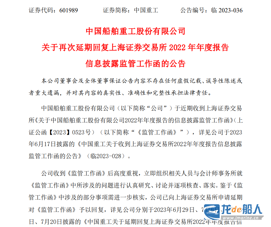 7月26日晚,中国船舶重工股份有限公司发布《关于再次延期回复上海证券交易所 2022 年年度报告
