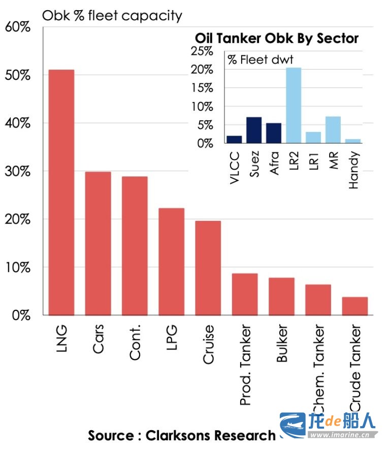 克拉克森在其每周通讯中指出,全球新船订单已经严重失衡,未来几年这种失衡会产生一系列后果,其数据(见下图)清楚展示了各细分市场的订单差异,并将这种现状描述为“双速”模式。