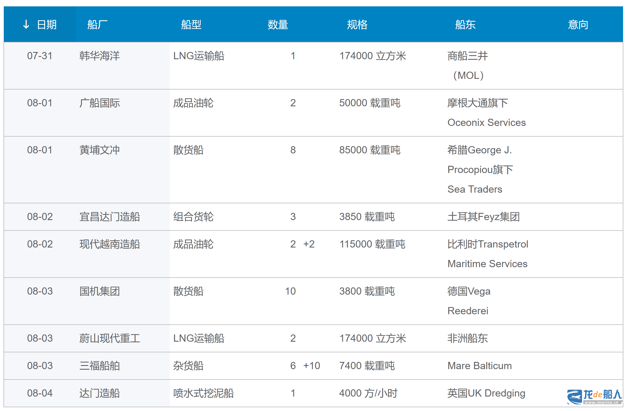 新船订单汇总(2023.7.31-8.6) 来源:龙de船人 2023-08-07 14:23 据龙船订单库(https://www.imarine.cn/order)跟踪统计,上周(7.31-8.6)公布的新船订单有35+12艘。 本站文章如未标明来源,均为本站编译、编辑或原创文章,转载请注明来自“龙de船人”,违者必究。