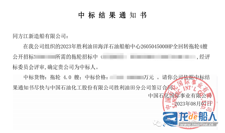 日前,从中国石化传来好消息,在中国石油化工股份有限公司胜利油田分公司批量拖轮建造项目招标中,同方江新造船有限公司从众多船厂竞争中脱颖而出,成功中标2023年胜利油田海洋石油船舶中心4艘5000HP全回转拖轮建造项目。