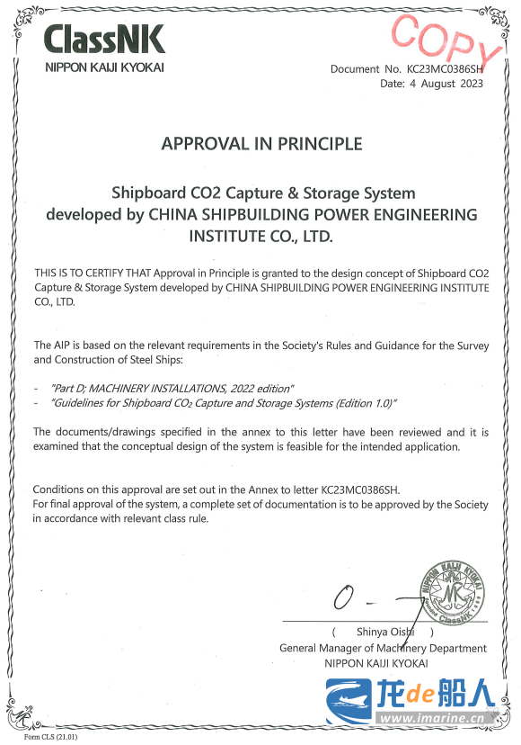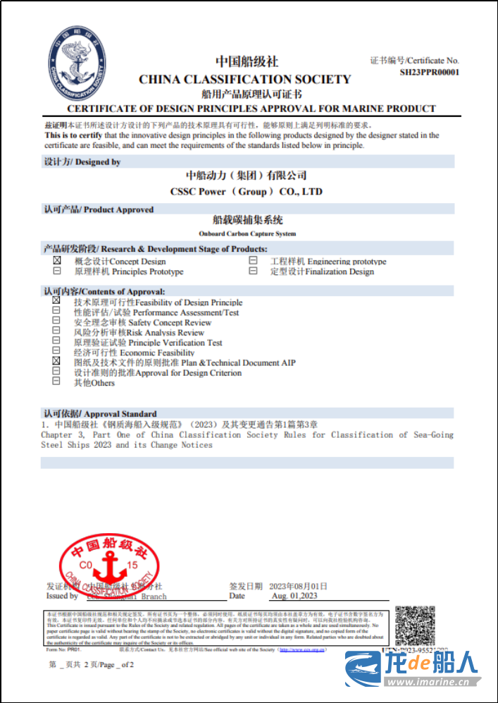 近日,中船动力(集团)有限公司自主开发的船载碳捕集系统(CPGC-CCS)成功获得了由中国船级社(2023年8月1日)和日本船级社(2023年8月4日)颁发的原理认可证书(AiP),为进一步承接船载碳捕集系统的商业订单奠定了基础,为实现绿色低碳船舶动力转型提供了新的解决方案。