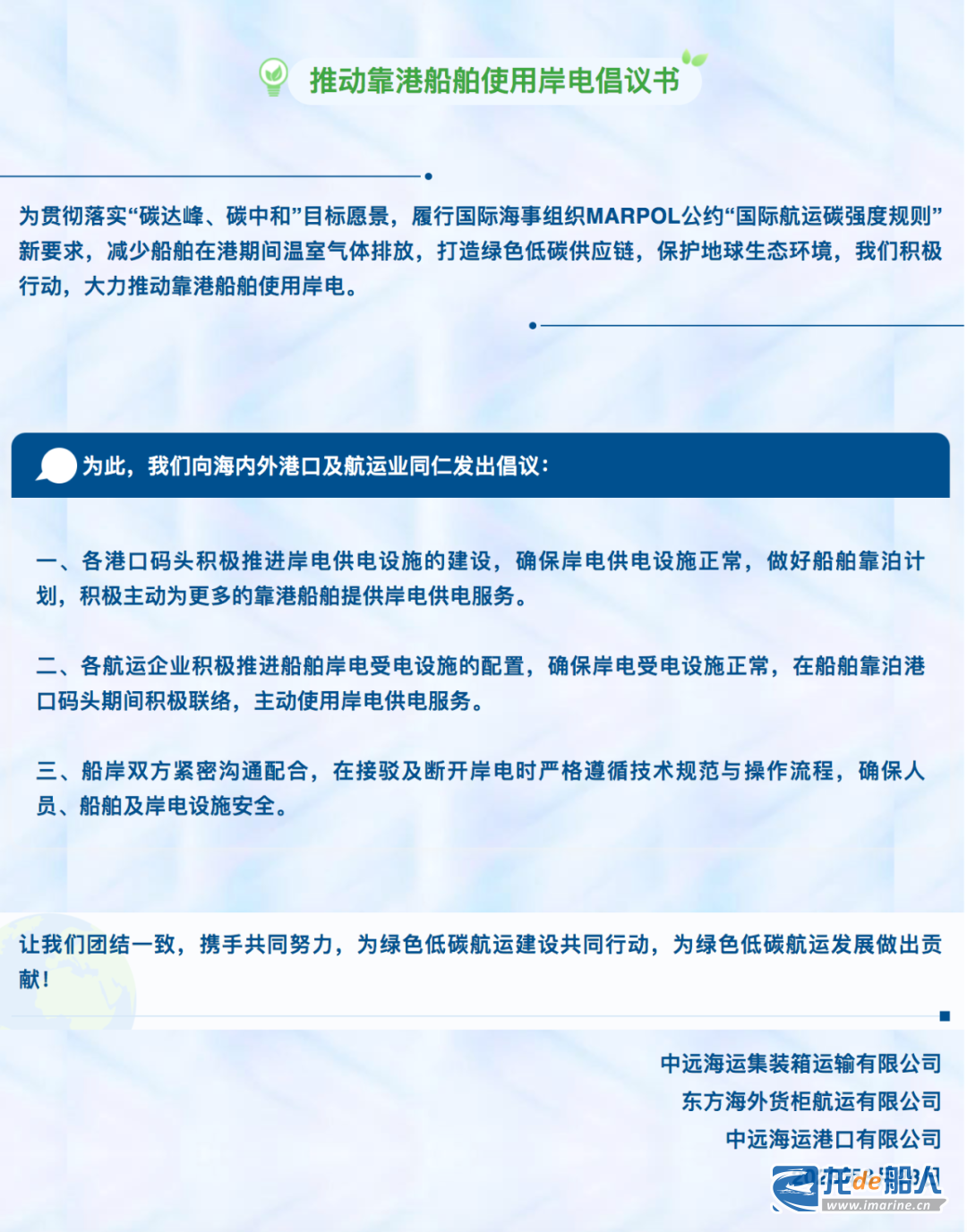 三家企业向海内外港口及航运业各方发出以下倡议:
