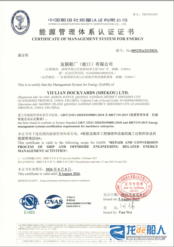 据了解,CCS认证公司于2023年6月25日至6月30日对友联船厂(蛇口)有限公司、招商局重工(深圳)有限公司质量管理体系、职业健康安全管理体系、环境管理体系、能源管理体系进行了年度审核。