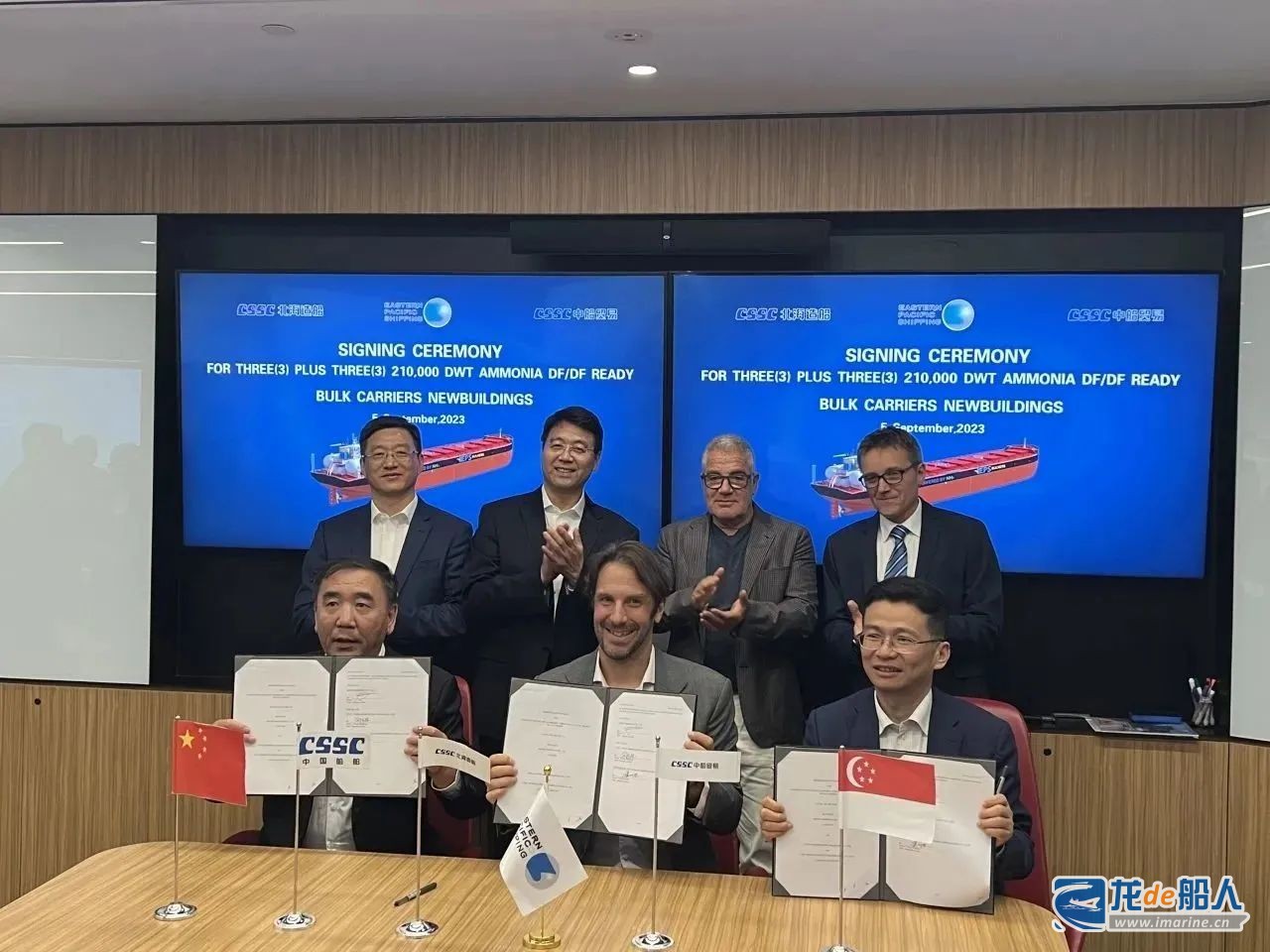 9月5日,中国船舶集团青岛北海造船有限公司联合中国船舶工业贸易有限公司与新加坡东太平洋航运(Eastern Pacific Shipping Pte. Ltd.)在新加坡举行了3+3艘21万吨Ammonia DF/DF Ready散货船建造项目签约仪式,开启了北海造船与新加坡东太平洋航运的首次合作。