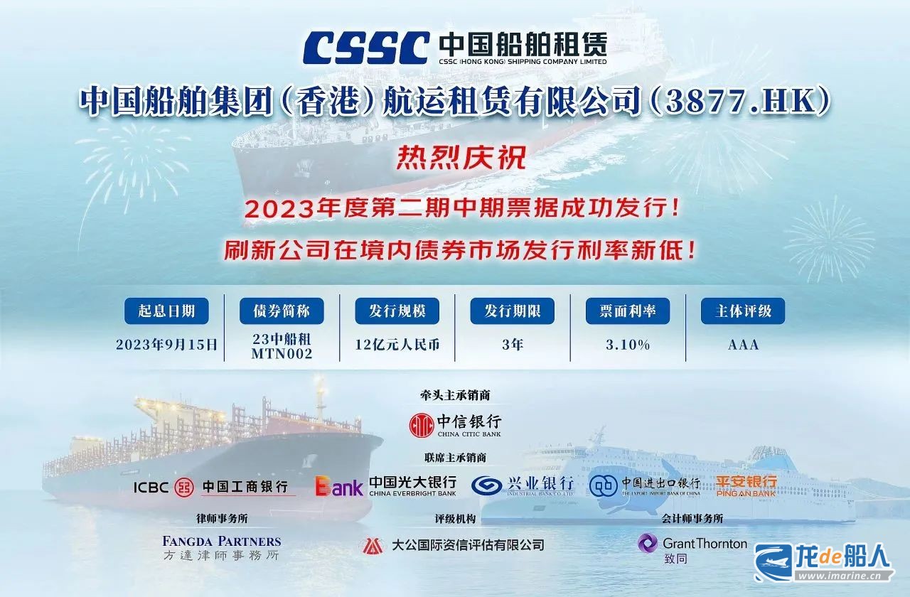 9月14日,中国船舶集团旗下中国船舶集团(香港)航运租赁有限公司(简称”中船租赁”)成功发行2023年度第二期中期熊猫债券。本期债券发行金额12亿元,发行利率3.10%,票面利率创下中船租赁发行利率的历史新低。