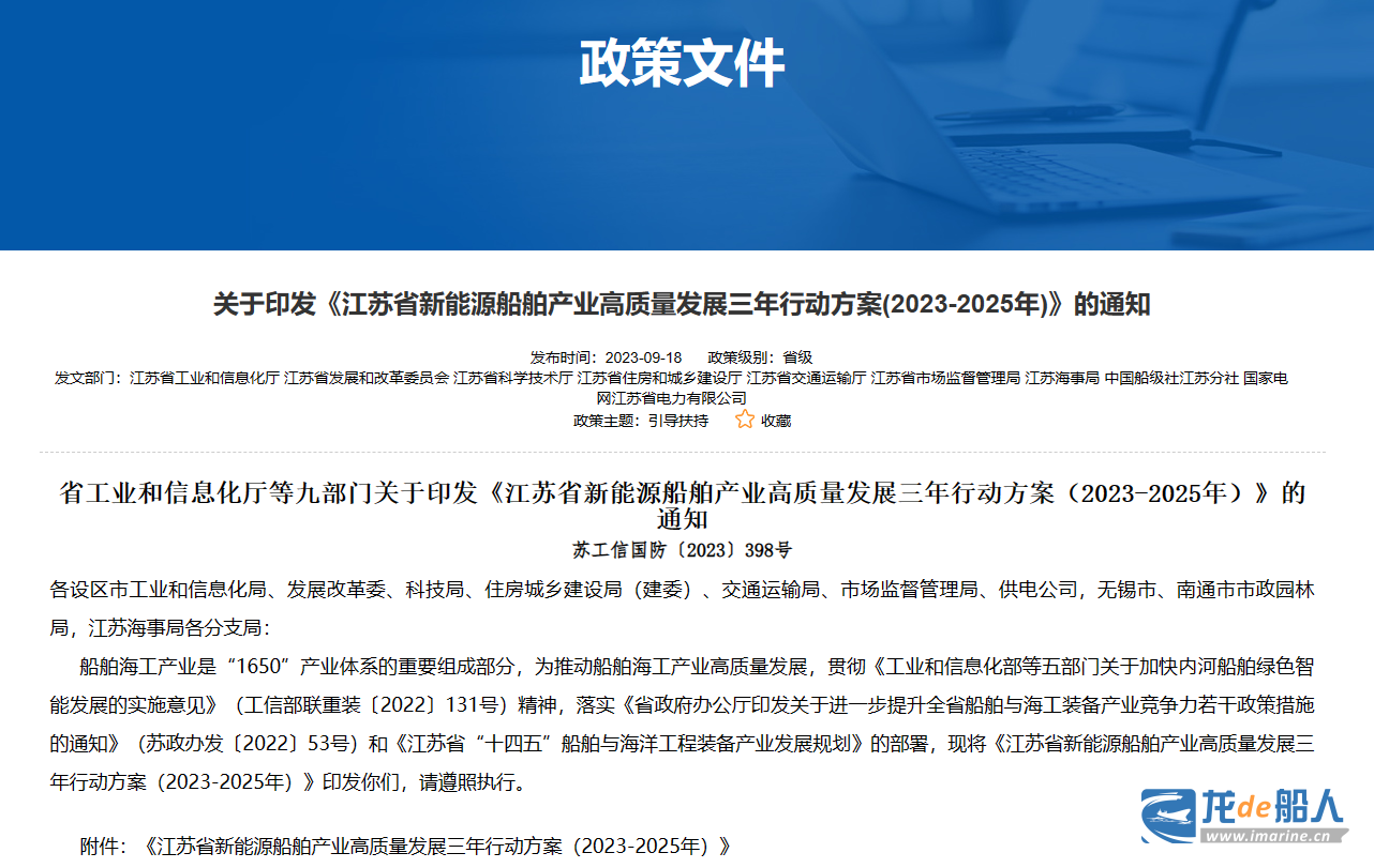 9月18日,江苏省工业和信息化厅等九部门印发《江苏省新能源船舶产业高质量发展三年行动方案(2023-2025年)》。《方案》提出,力争到2025年,新能源船舶全产业链发展环境不断优化,具备新能源船舶和关键核心装备的研发设计能力,形成核心装备供给能力;建成不少于5种引领市场、适合市场的新能源典型船型,打造一批新能源船舶试点示范项目,推动建设新能源船舶航线;推出一批引领船舶全产业链高质量发展的规范标准。