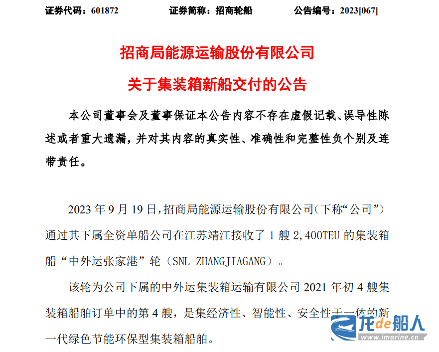 9月19日,招商局能源运输股份有限公司发布《关于集装箱新船交付的公告 》。