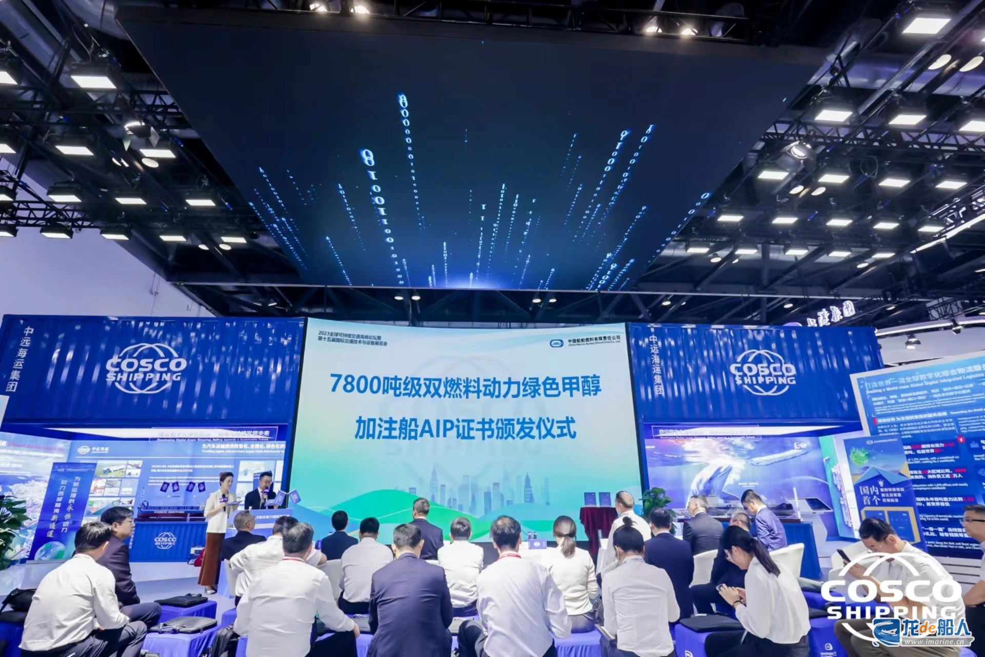 会上,中国石油流通协会和中国出入境检验检疫协会分别宣布了由中国船燃牵头发起的《船用甲醇燃料水上加注规程》《船用甲醇燃料》两个团体标准正式发布,并由中国船级社(CCS)和必维船级社(BV)为中国船燃、中远海运重工等分别颁发7800吨级双燃料动力绿色甲醇加注船原则性认可证书(AIP证书)。