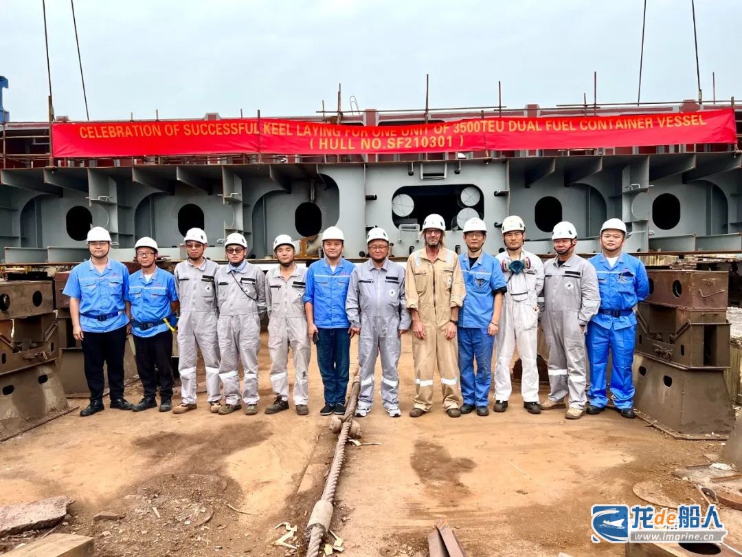 9月28日,三福船舶为德国船东建造的首艘3500TEU双燃料集装箱船在4#船台举行上船台合拢仪式。