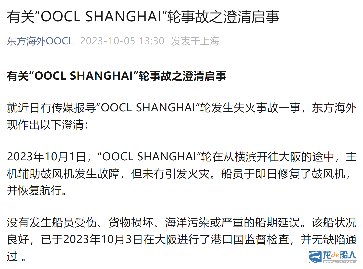 2023年10月1日,“OOCL SHANGHAI”轮在从横滨开往大阪的途中,主机辅助鼓风机发生故障,但未有引发火灾。船员于即日修复了鼓风机,并恢复航行。