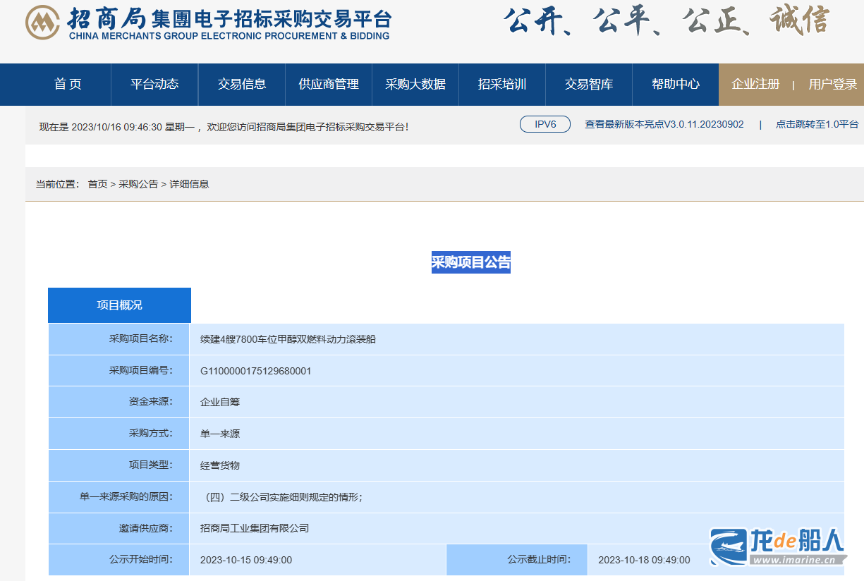 据招商局电子招标平台10月15日消息,招商局能源运输(香港)有限公司发布采购项目公告《续建4艘7800车位甲醇双燃料动力滚装船》,采购方式为“单一来源”。