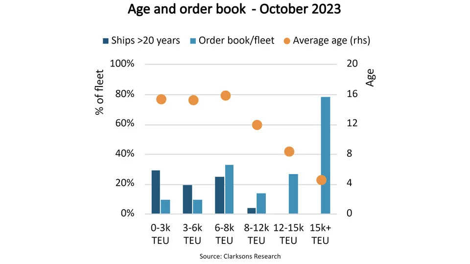 在0-2999TEU尺寸段,目前有317艘新船在订,但有994艘船龄超过20年。同样,BIMCO数据显示,3000-5999TEU尺寸段有210艘船龄超过20年,但新船订单量仅为100艘。