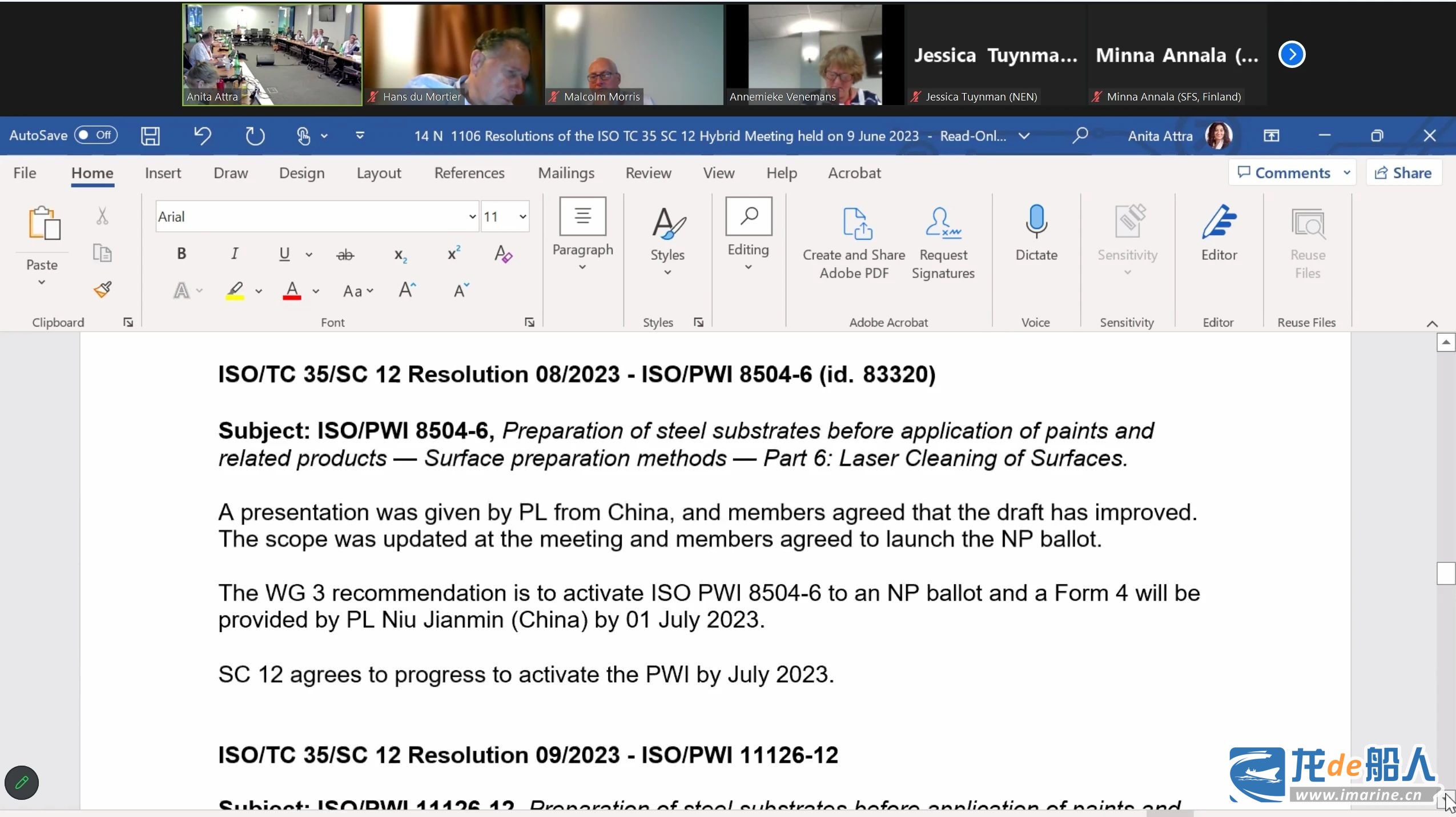 11月4日,由中国船舶集团有限公司第十一研究所、中国船舶集团有限公司综合技术经济研究院、湖北工业大学、沪东中华造船(集团)有限公司主导提出的国际标准新项目提案ISO/PWI 8504-6《涂覆涂料前钢材表面处理 表面处理方法 第6部分:激光清洗》在ISO/TC35/SC12的提案阶段(NP)投票中获得多个国家支持并成功立项。