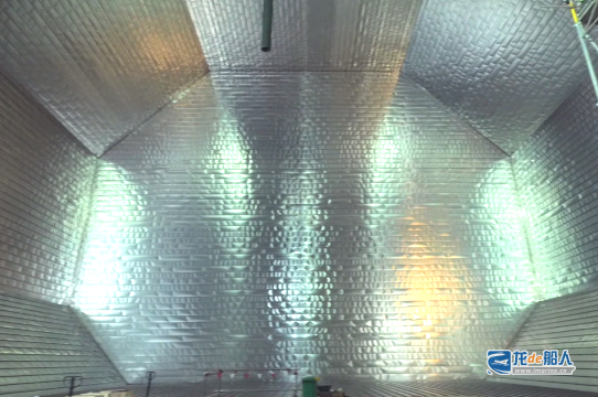“绿能瀛”的货舱被通俗地叫做“超级冷库” ,也是这艘LNG(液化天然气)船最核心的位置, 像4号货舱里面的空间非常的巨大, 总的容量超过了5万立方米, 它的横截面的周长需要87人才能环抱一圈。