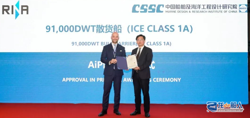 12月5日,中国船舶及海洋工程设计研究院(MARIC)自主研发的90000 DWT Arc4冰区散货船获得意大利船级社(RINA)原则性认可(AiP)证书,意大利船级社中国区运营总监Luigi MATTERA 出席MARIC新品推介会,并颁发AiP证书。
