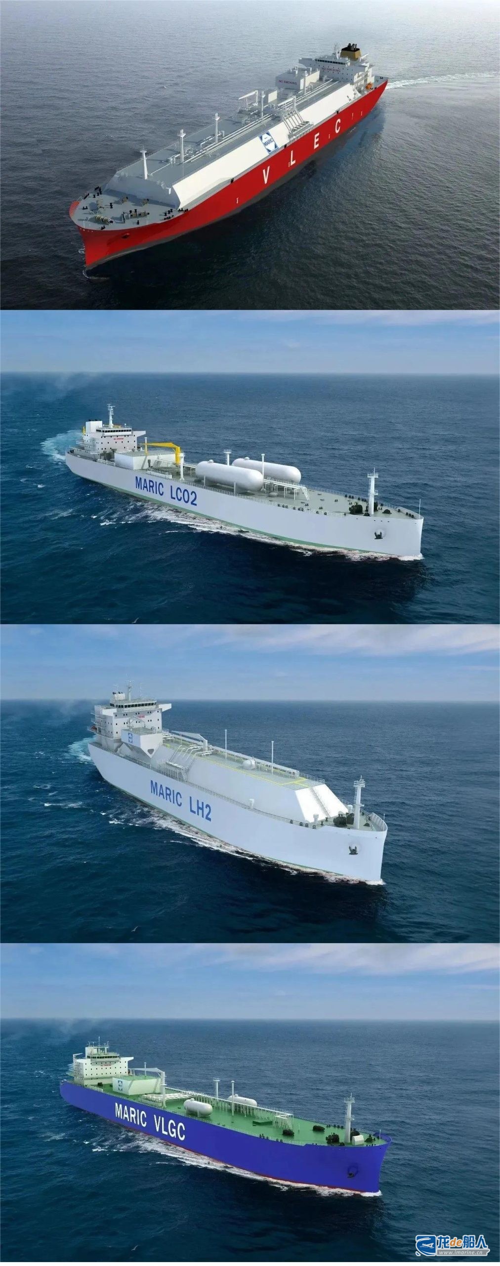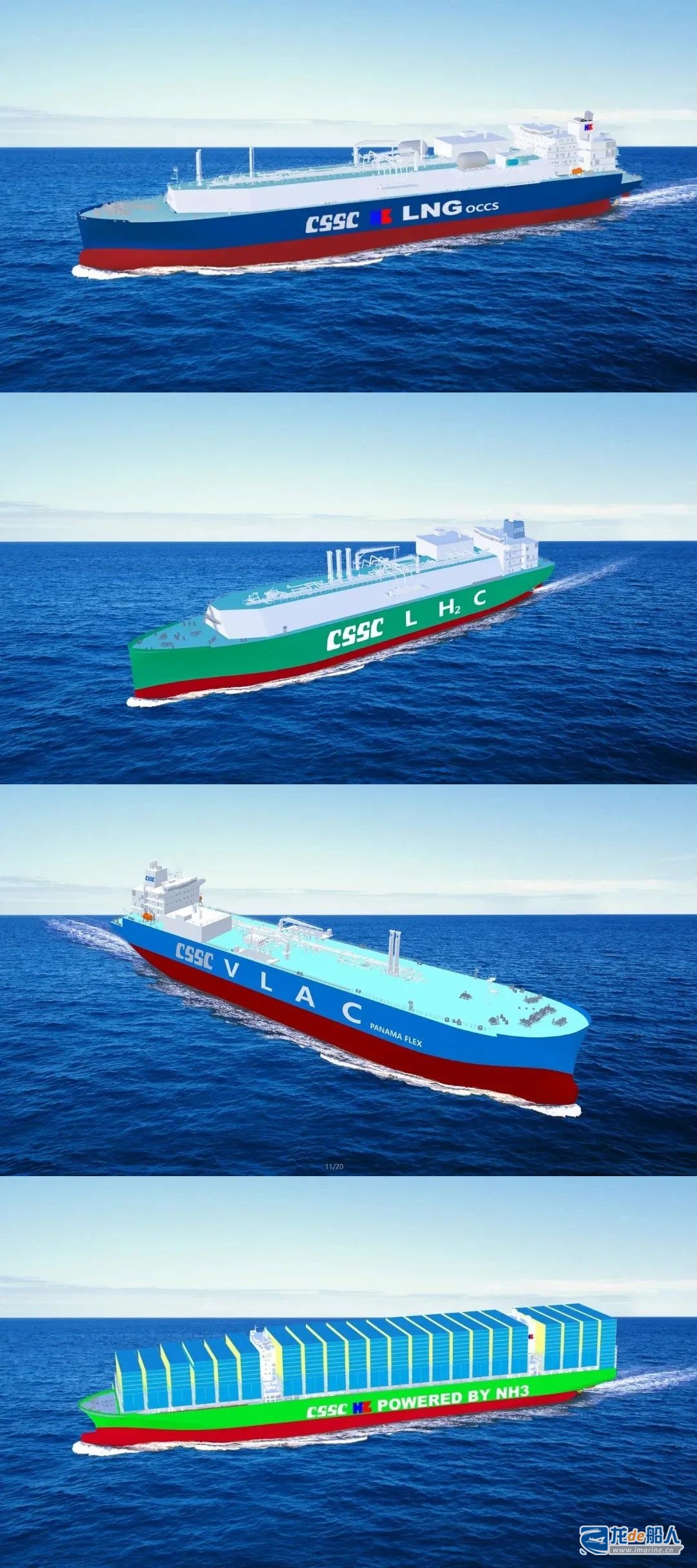 沪东中华造船(集团)有限公司发布配装碳捕捉系统(OCCS)的17.4万方LNG船;4万方液氢运输船;8.8万方液氨运输船;16000TEU氨动力集装箱船。