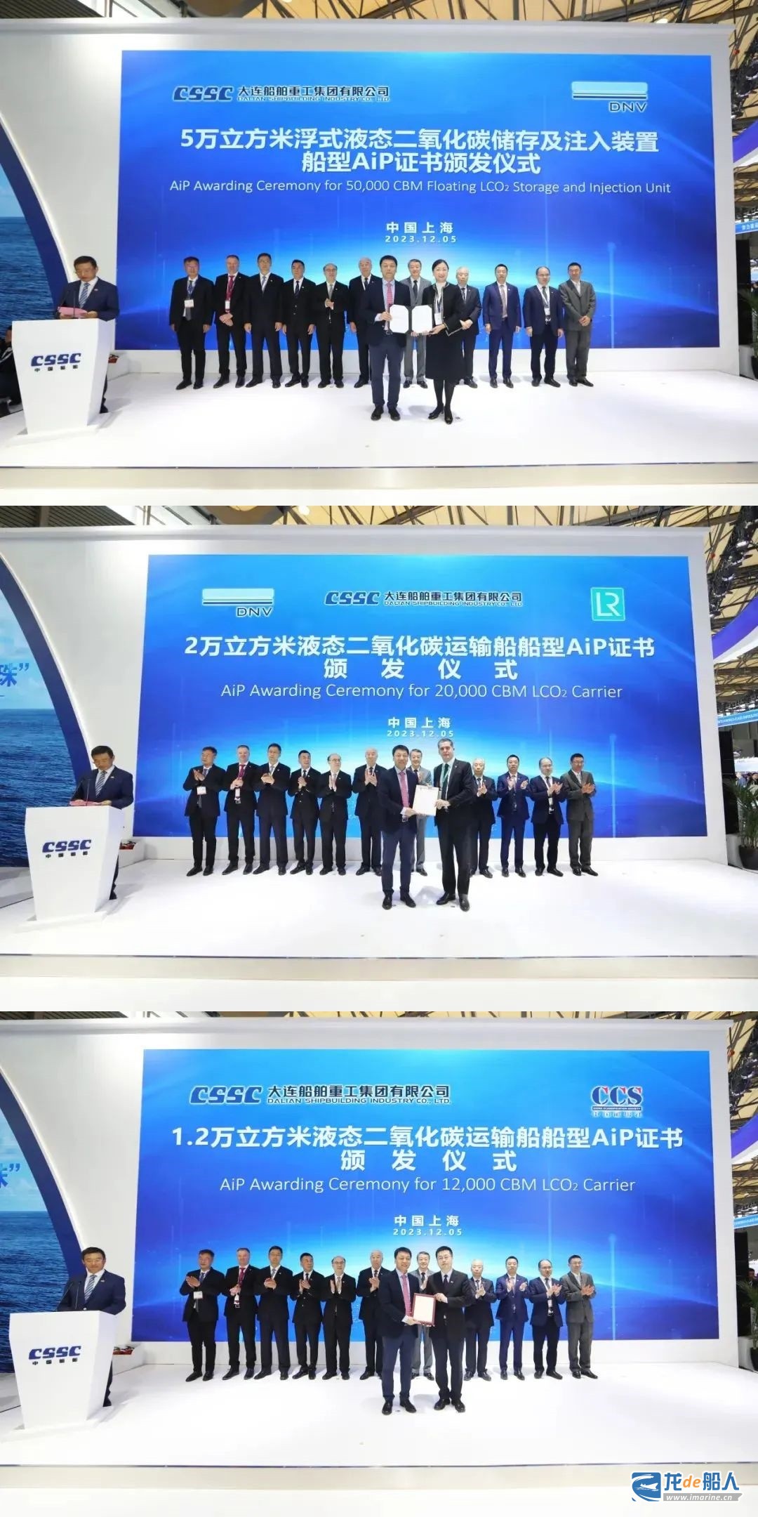 大连船舶重工集团有限公司发布5万立方米浮式液态二氧化碳储存及注入装置;2万立方米液态二氧化碳运输船;1.2万立方米液态二氧化碳运输船。