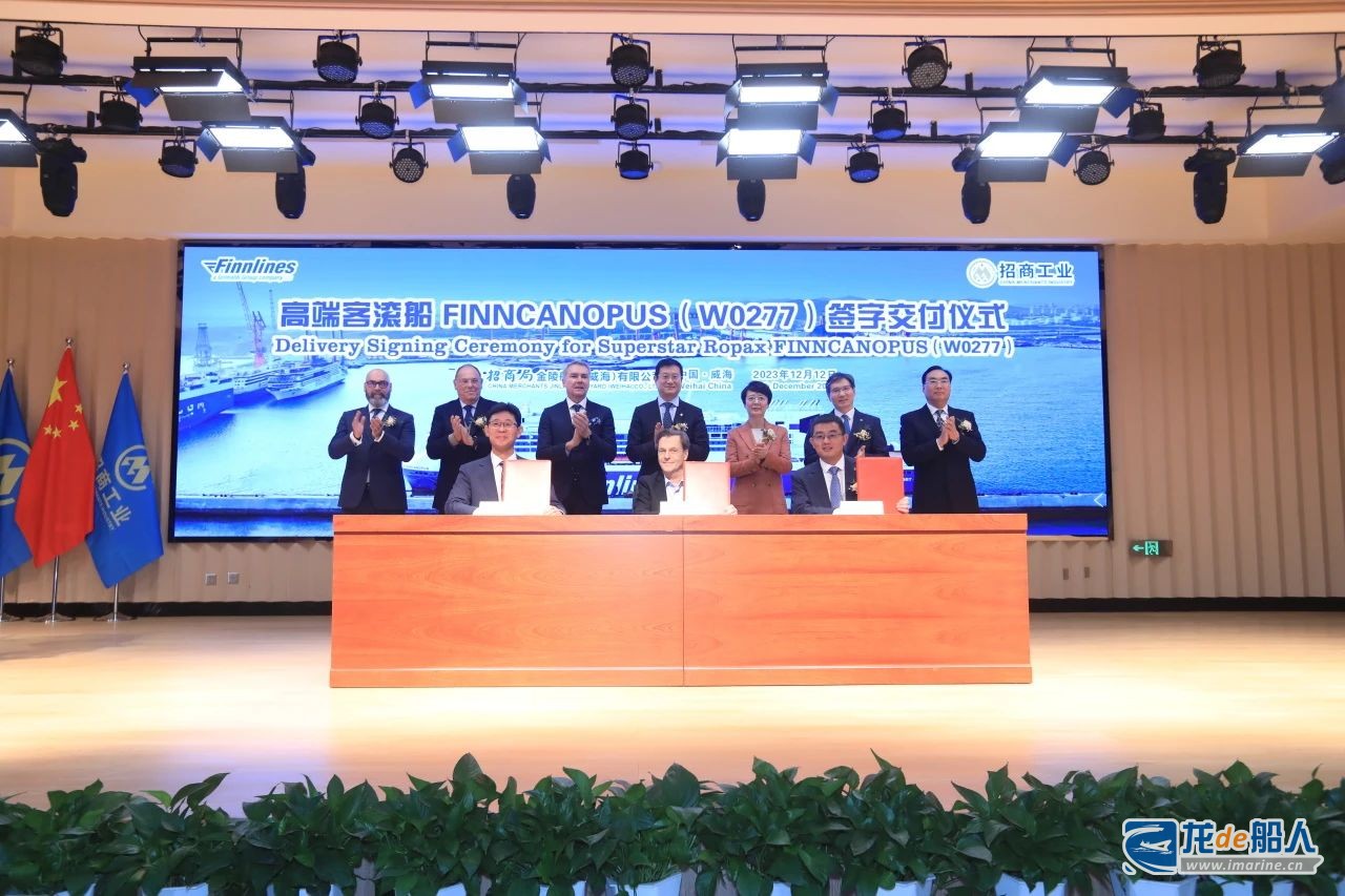 12月12日,招商局金陵船舶(威海)有限公司为意大利Grimaldi集团旗下Finnlines Plc公司建造的第二艘Superstar系列混合动力邮轮级高端客滚船“Finncanopus”号(W0277)在威海签字交付,标志着Finnlines在招商工业总计5艘价值5亿欧元(约合人民币38.66亿元)的绿色船舶建造项目圆满完成。